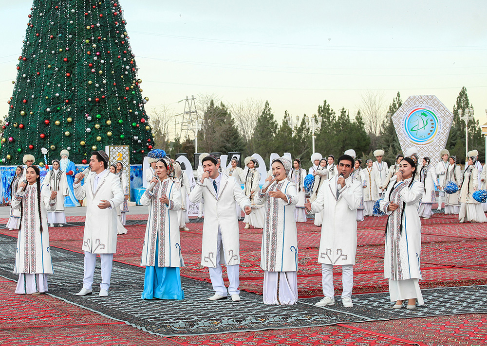 Belentden ýaňlanan şirin owazly aýdym-sazlar, döredijilik toparlarynyň joşgunly tanslary baýramçylyga özboluşly öwüşgin berdi. Ýerine ýetirilen aýdym-sazlarda Gahryman Arkadagymyzyň, hormatly Prezidentimiziň beýik işleriniň, Täze ýylyň, Halkara parahatçylyk we ynanyşmak ýylynda gazanylan üstünlikleriň, ajaýyp döwrümiziň, dost-doganlygyň, agzybirligiň waspy ýetirildi.